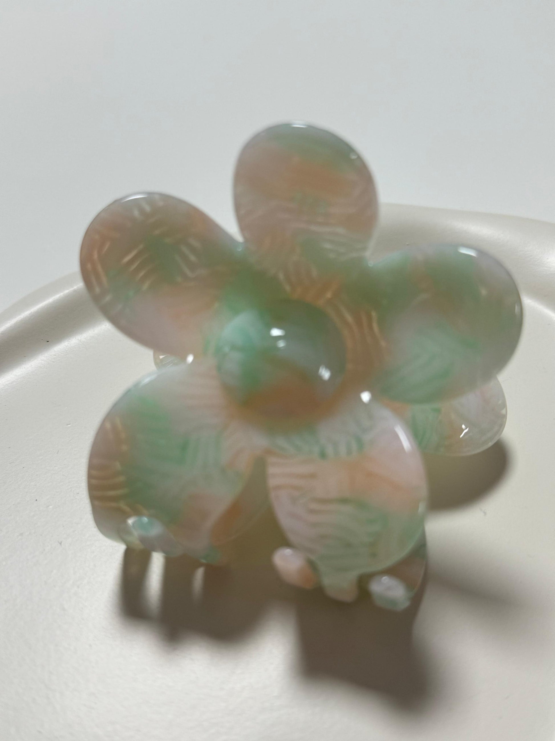 Das florale Design in sanften Pastellfarben wie Grün, Apricot und Weiß macht diese Haarspange zu einem charmanten Blickfang – ideal für Frühling, Sommer und jede stilvolle Frisur.