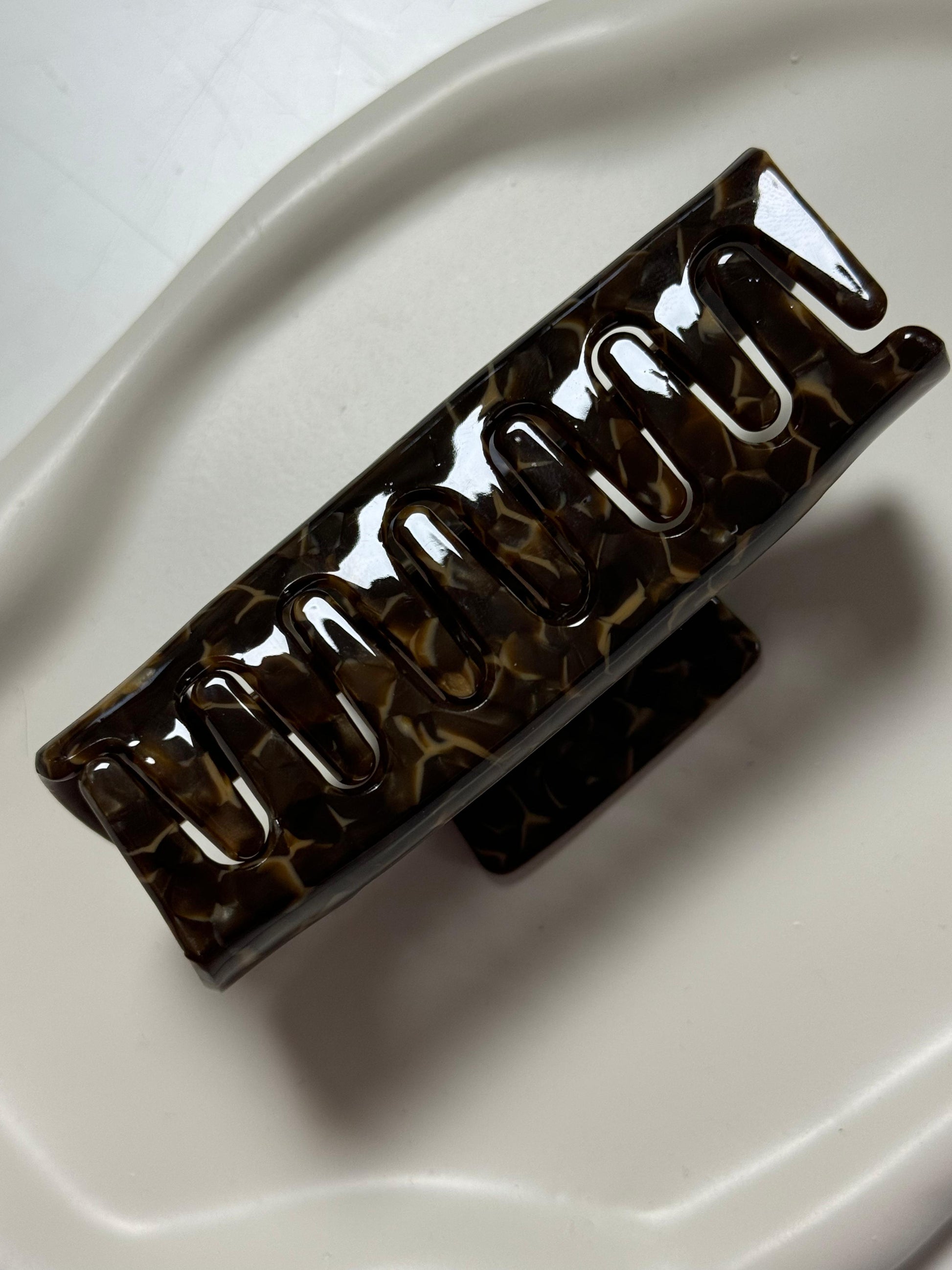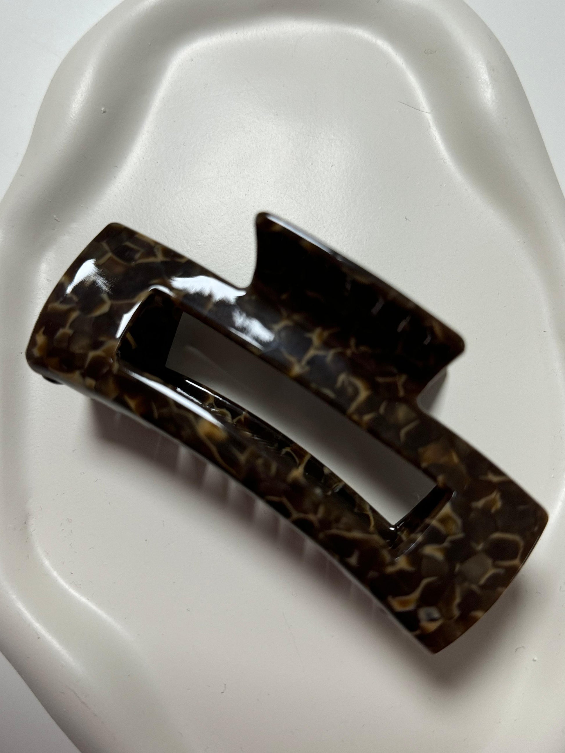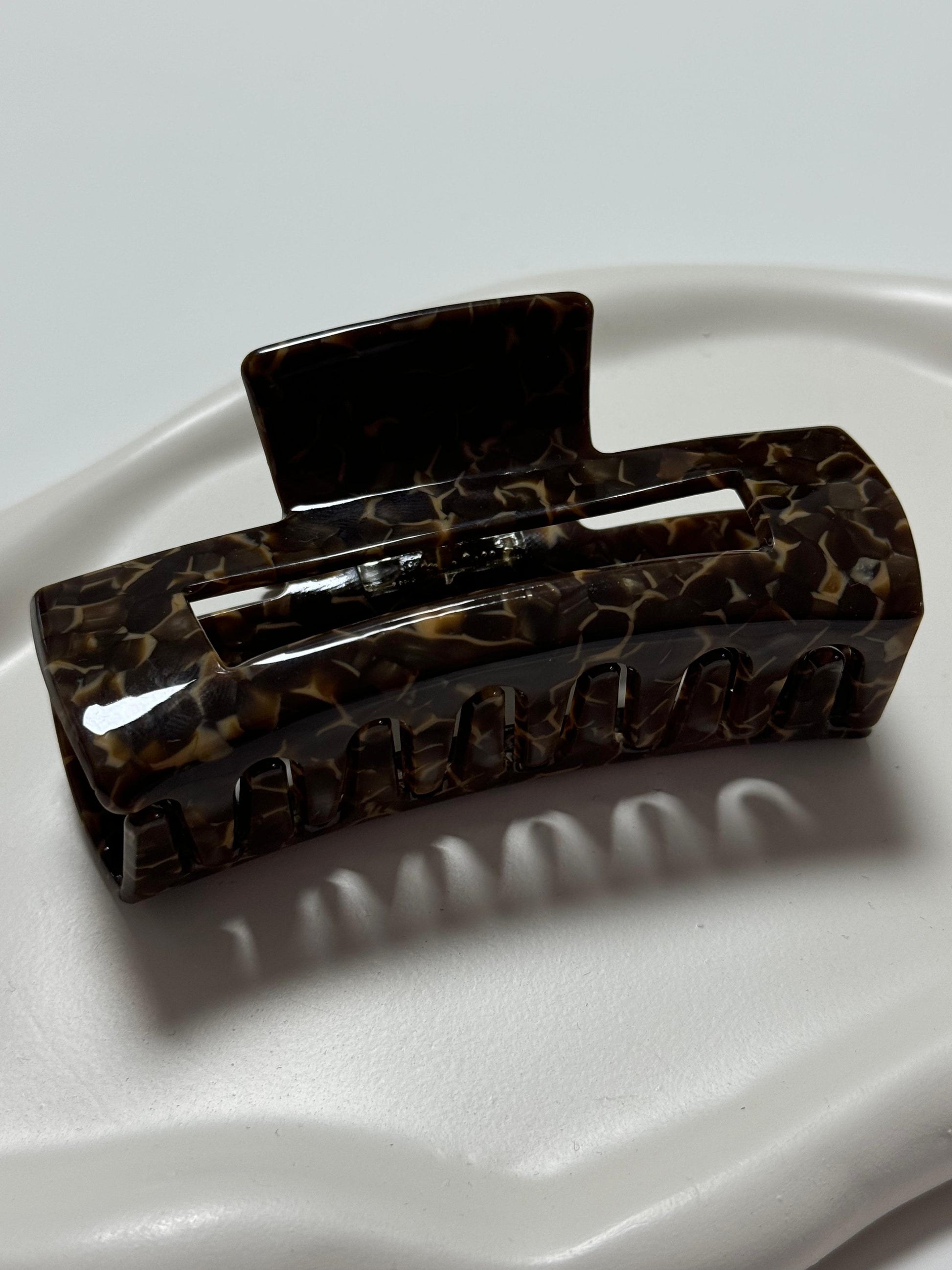 Die Haarklammer „Deep Tortoise“ vereint klassischen Schildpatt-Look mit moderner Form. Die dunkle, tief gemusterte Oberfläche sorgt für einen eleganten und zeitlosen Look – ideal für strukturierte Frisuren oder schnelles Hochstecken im Alltag. Die stabile Mechanik bietet zuverlässigen Halt für mittleres bis kräftiges Haar.
