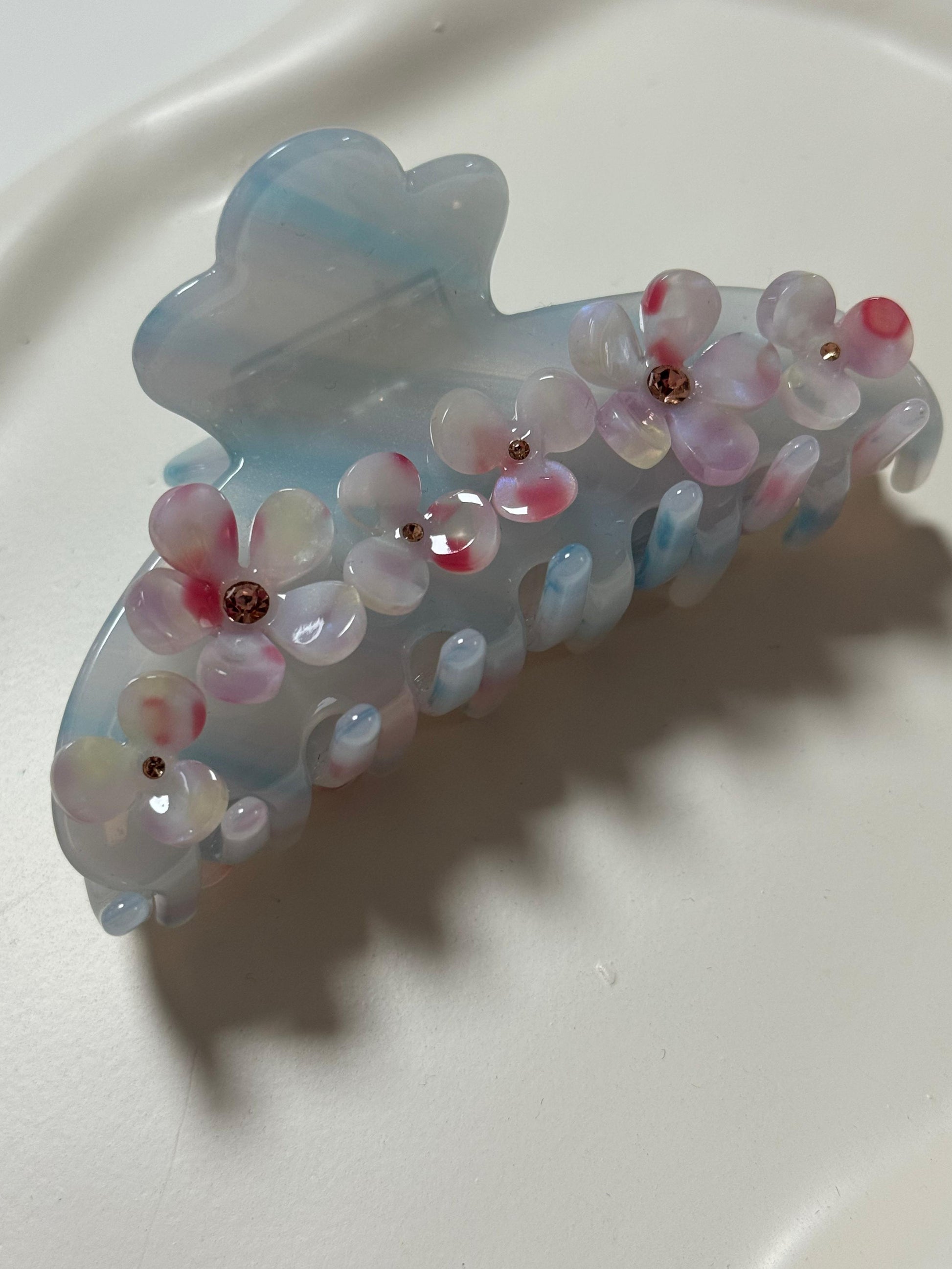 Die Haarklammer „Floral Mist“ ist ein echter Blickfang: Zart schimmerndes Hellblau trifft auf liebevoll gestaltete Blüten in Pastellrosa und Rot, veredelt mit kleinen funkelnden Steinchen. Die geschwungene Form sorgt nicht nur für einen sicheren Halt, sondern auch für einen femininen, verspielten Look – perfekt für elegante Alltagsfrisuren oder besondere Anlässe.