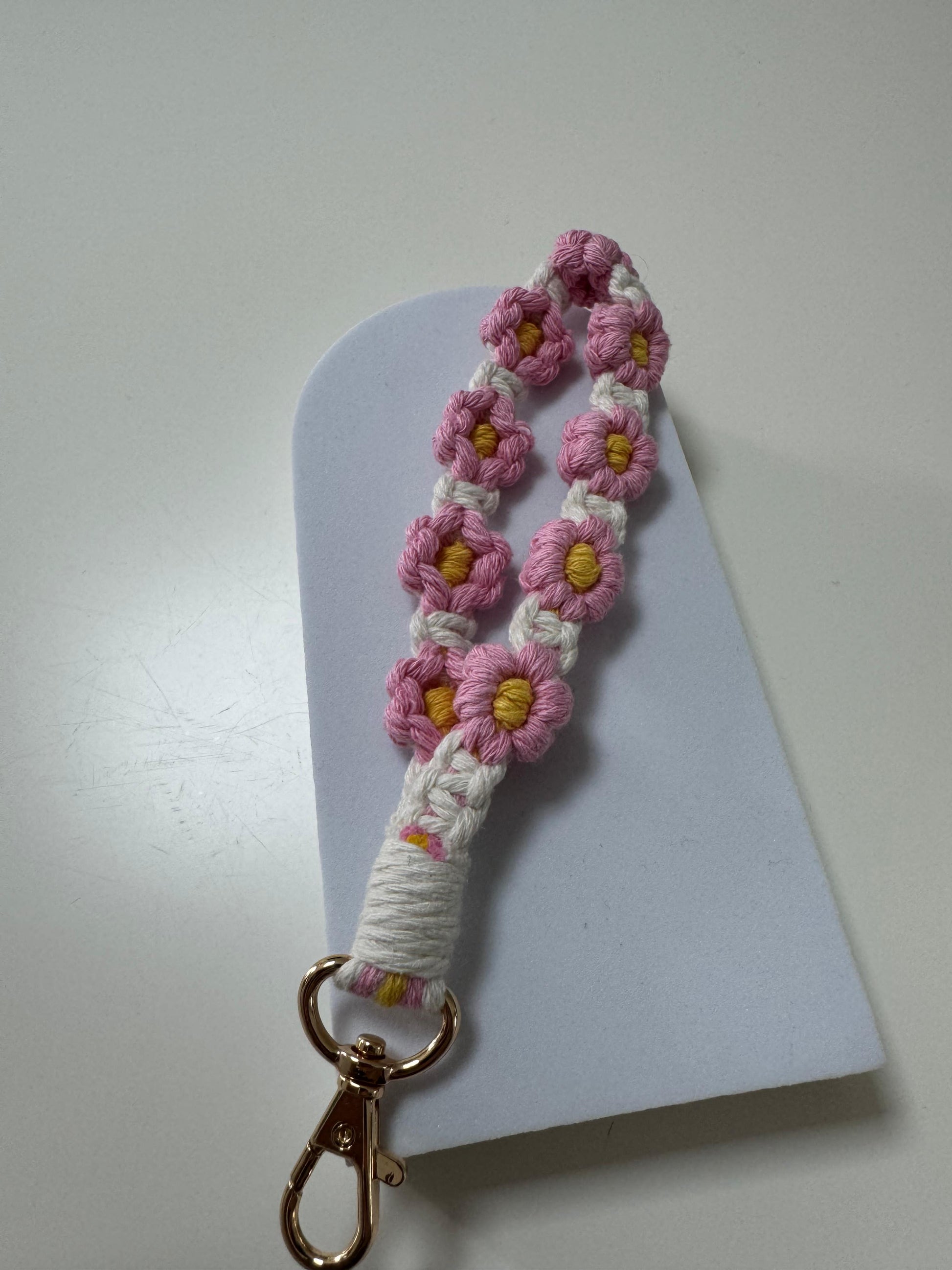 Jeder Anhänger besteht aus hochwertiger Baumwollkordel und ist mit kleinen, gehäkelten Blüten in zarten Farben (Lila, Grün oder Rosa) verziert. Der stabile Karabinerhaken in elegantem Goldton sorgt dafür, dass du deine Schlüssel oder Accessoires sicher und stilvoll bei dir trägst.