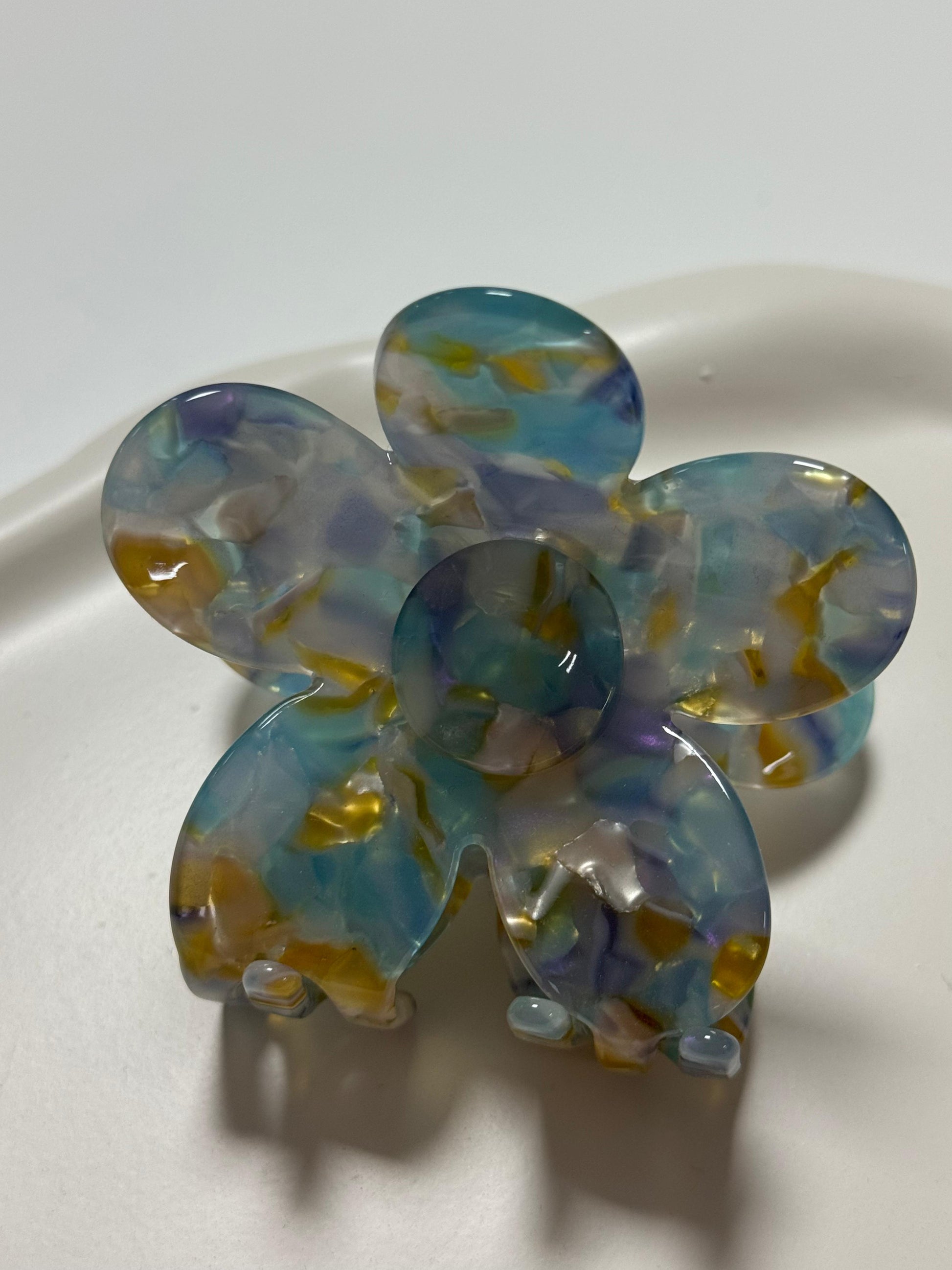Tauchen Sie ein in einen Hauch von Meeresfrische mit der Ocean Bloom Haarspange – einer stilvollen Blütenspange, die mit ihrer faszinierenden Farbgebung aus Blau-, Gold- und Lilatönen begeistert. Das florale Design in Marmoroptik macht sie zu einem ausdrucksstarken Accessoire für jedes Outfit.